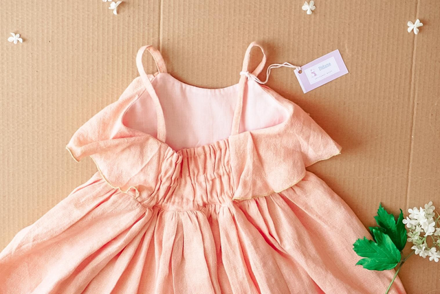 Robe à bretelles, en lin rose saumon et doré.