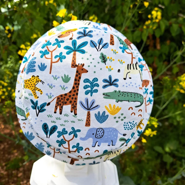 Chapeau pour bébé et enfant. Imprimé animaux de la jungle. Doublure en coton marron. 100% coton Tailles disponibles: 6-9 mois / 43,5 - 45,7 cm 9-18 mois / 46 - 49 cm 2-3 ans / 49,5 - 52 cm 4-6 ans / 52 - 54,5 cm